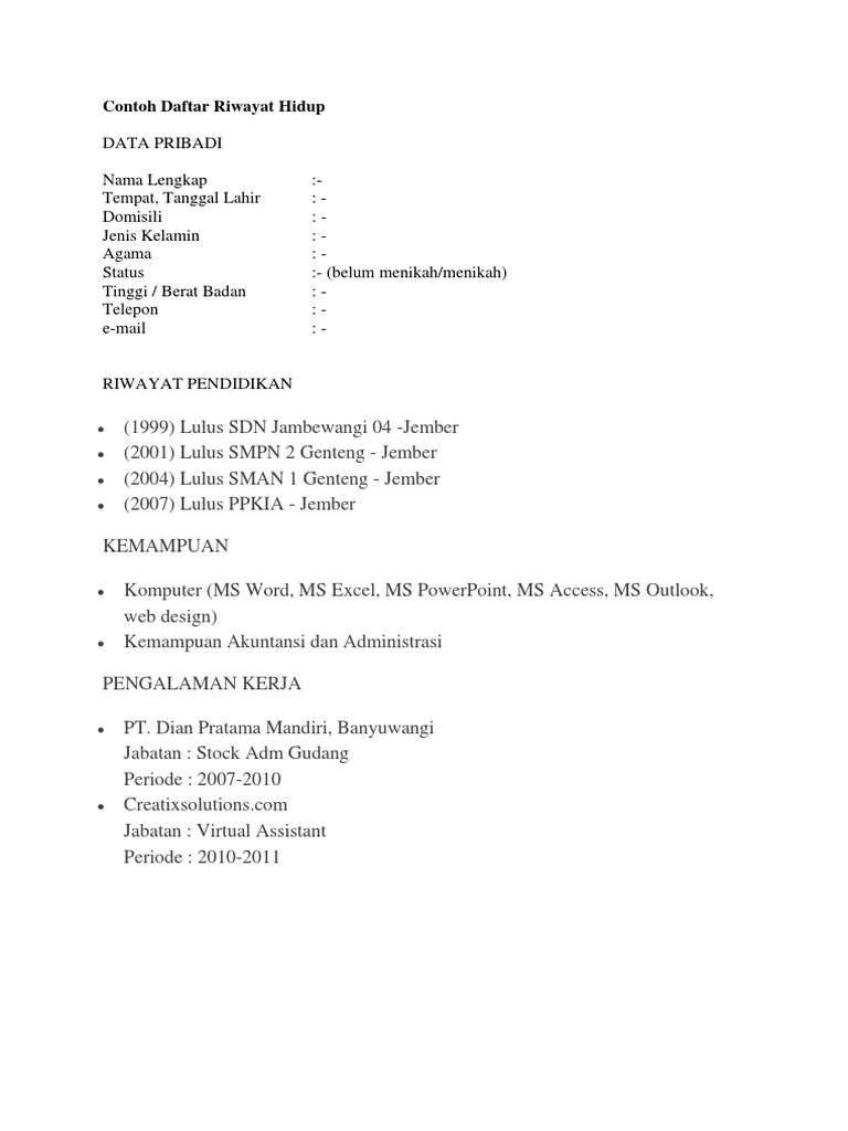 Bentuk daftar riwayat hidup cv yang diminta tiap perusahaan tidak selalu sama, ada yang mengharuskan dalam bentuk ketikan dan ada juga yang meminta dalam bentuk tulis tangan. Cara menjiplak yang sudah jadic. Foto copy ijazah dan transkrip nilai akademik. Harga tertera untuk 1 pack. Surat riwayat hidup juga biasanya selalu berpasangan dengan surat lamaran pekerjaan bisa kamu baca disini seputar surat lamaran dan contoh surat berikut postingan mengenai perbedaan curriculum vitae (cv) dan daftar riwayat hidup beserta contoh cv menarik perhatian perusahaan. Jangan menggunakan kertas bergaris, berwarna atau yang desainnya meriah. Semua produk yg kami jual dijamin 100% asli sesuai tampilan karna semua produk yang kami pajang di etalase semuanya gambar hasil jepretan sendiri. Gunakan kertas putih polos saat kamu akan mulai membuat daftar riwayat hidup. Petunjuk pengisian daftar riwayat hidup data yang diisi harus sesuai dengan anak data lampiran yang i ada c keputusan di ijazah kepala badan yang digunakan untuk melamar kepegawaian negara nomor Kumpulan gambar grafiti ini bisa kalian jadikan sebagai referensi untuk belajar cara membuat graffiti di kertas bagi pemula. Fungsi daftar riwayat hidup untuk mempermudah bagian personalia dalam mengetahui secara singkat data penting mengenai diri pelamar yang bersangkutan. Surat daftar riwayat hidup dibuat secara simpel contoh daftar riwayat hidup atau curriculum vitae di tunjukkan gambar berikut. Terakhir, tulislah daftar riwayat hidup anda dengan penuh kejujuran serta tak ada unsur manipulasi yang mana di kemudian hari bisa menyebabkan ketidakpercayaan perusahaan kepada anda.