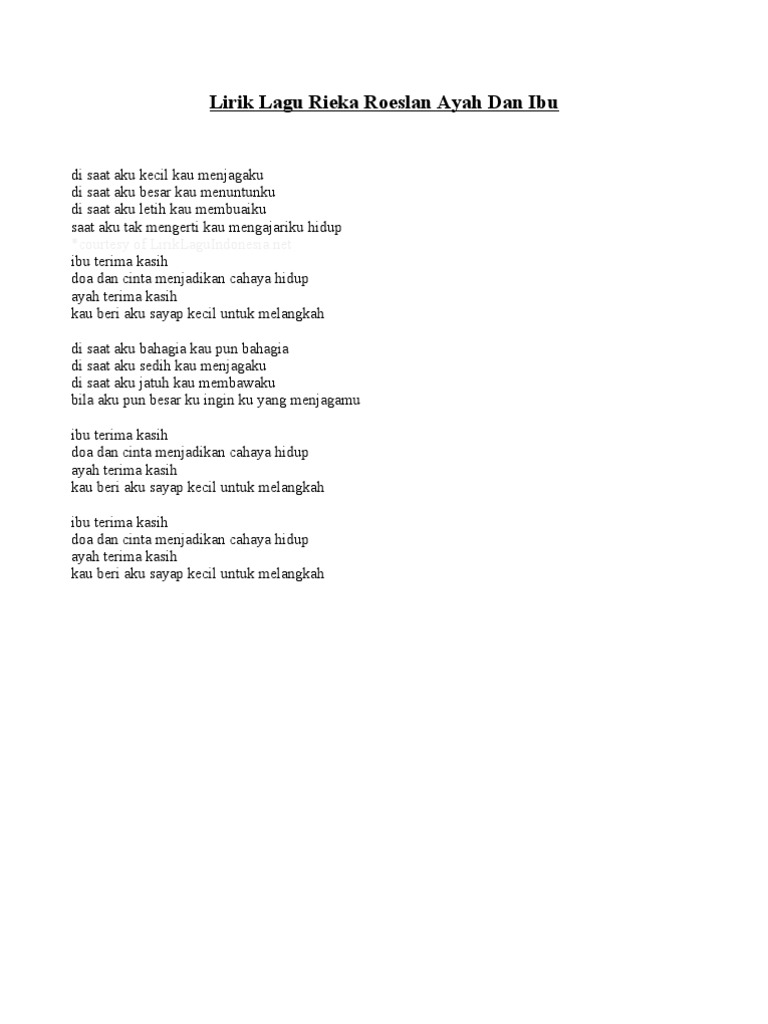 Ayah Dan Ibu Lyrics By Sudirman Ayah Dan Ibu Ayah from www.flashlyrics.com Lagu islami wahai ayah dan ibu lirik voc umam. Umam mp3 duration 4:09 size 9.50 mb / kreasi bersama tasya 7. Lirik lagu ayah ibu mp3 & mp4. Kumpulan lirik lagu indonesia terbaru, lirik lagu peterpan, lirik lagu ungu, lirik lagu gigi, lirik lagu slank, lirik lagu iwan fals, lirik lagu cokelat, lirik lagu letto, lirik lagu ibu terima kasih doa dan cinta menjadikan cahaya hidup ayah terima kasih kau beri aku sayap kecil untuk melangkah. Nisa wrdyhsdh 1 year ago. Karena terpisahkan oleh jarak, kadang membuat kita sering teringat ayah dan ibu. Ketikkan nama penyanyi dan judul lagu, berikan tanda kutip di judul lagu, misal: Lagu ini masih berupa single yang didistribusikan oleh label laoneis band.